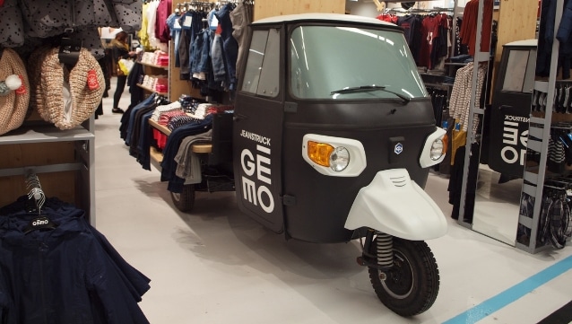 Des objets décalés et urbains, comme ce véhicule, sont utilisés comme portants pour les vêtements. Crédit : Camille Boulate